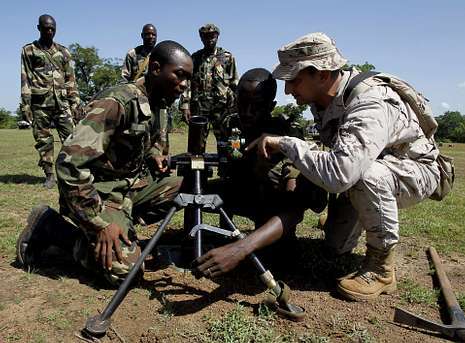 Un soldado español enseña a soldados malienses en unas prácticas de artillería con morteros.