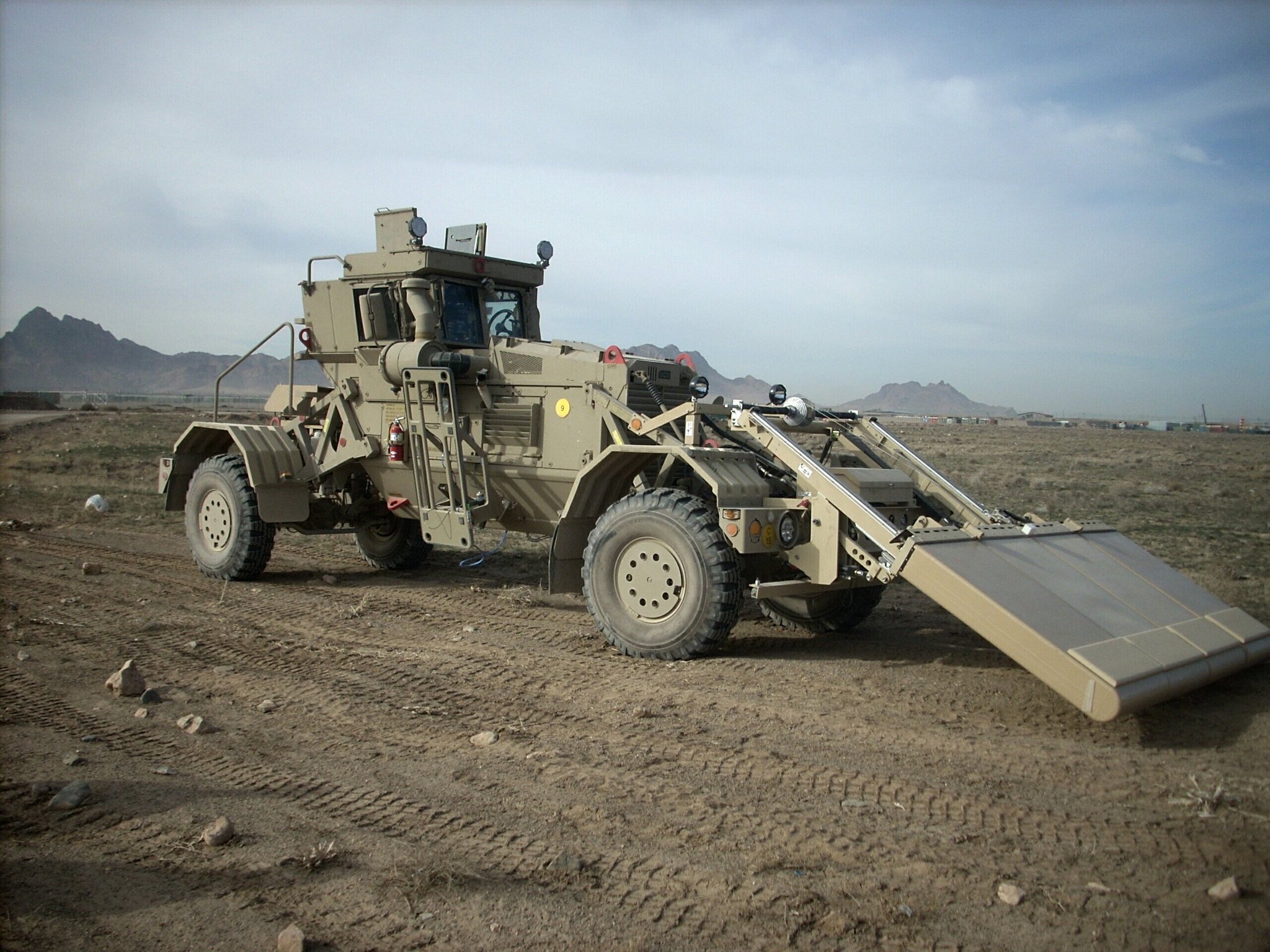 El “Husky” se usó inicialmente para detectar minas en África y luego se equipó para satisfacer las necesidades de limpieza de ruta de los soldados estadounidenses. El vehículo Husky es un híbrido de tractor y Humvee, con un casco en forma de V que resiste explosiones.